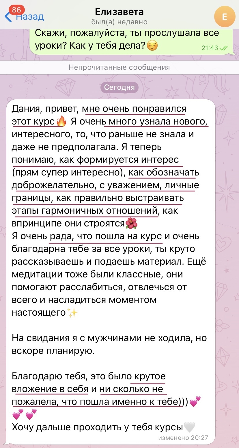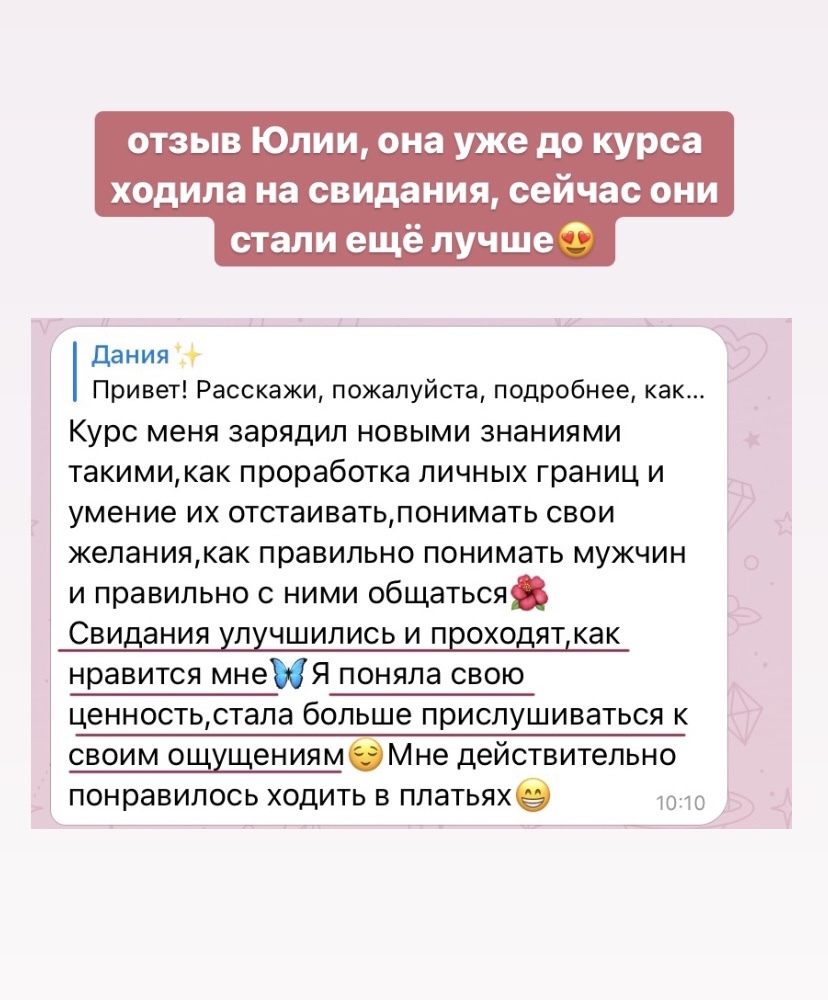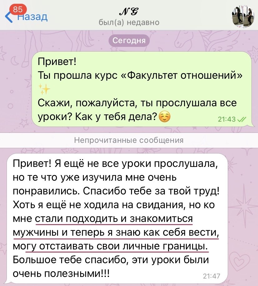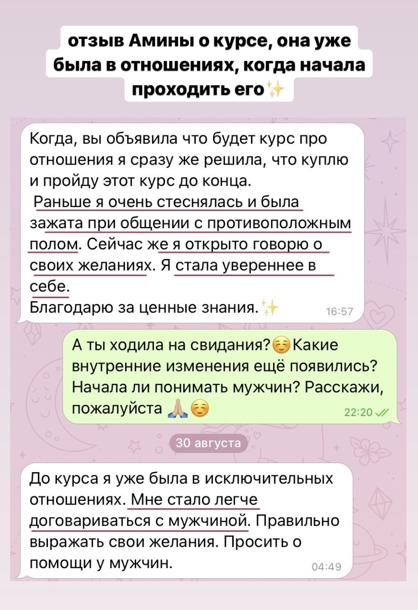 Я советую проходить этот курс девушкам с 15 лет и до неограниченного возраста💕Ведь знания в области построения отношений актуальны всегда!