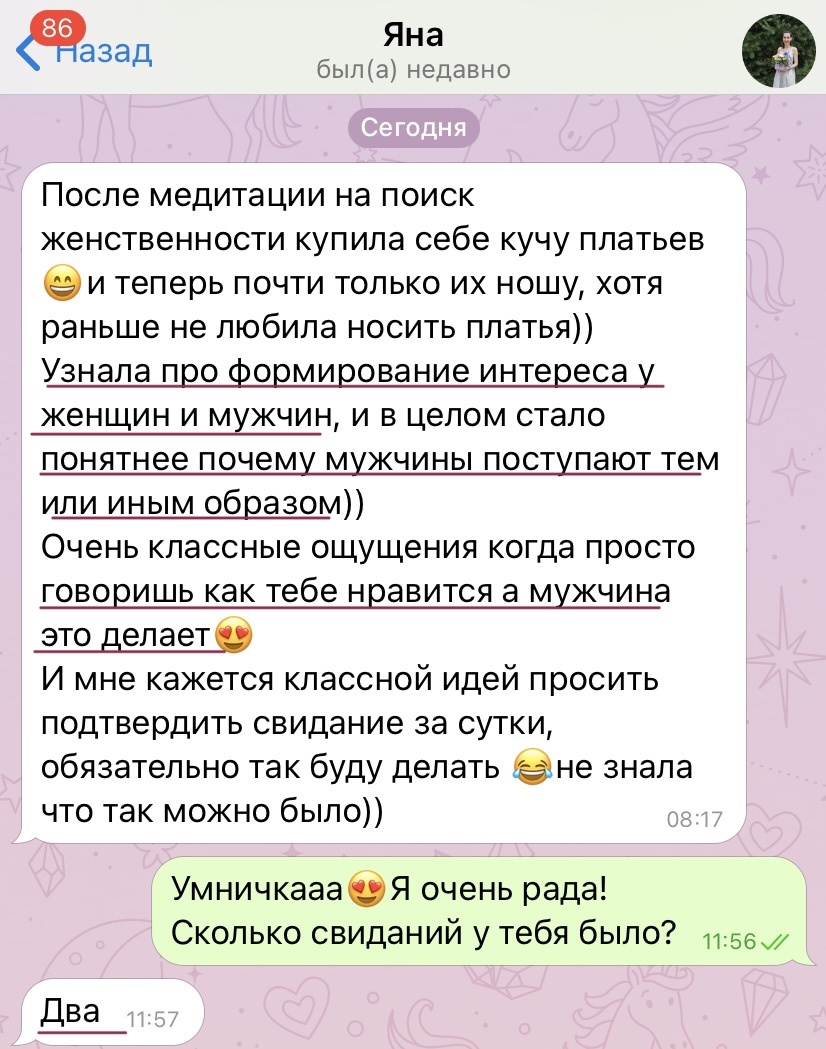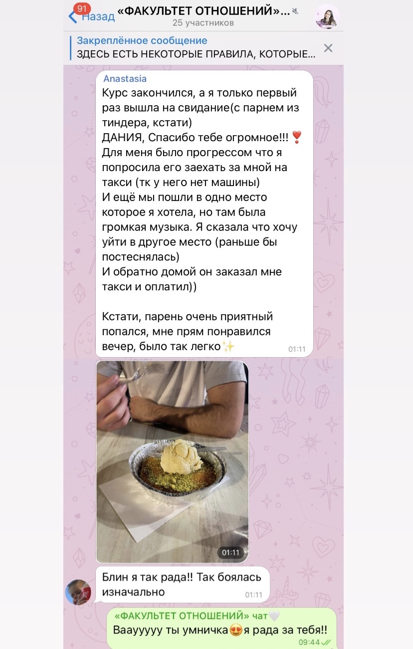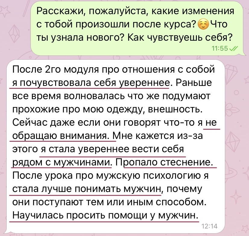 Ты проработаешь негативные установки по поводу отношений с мужчинами, станешь более уверенной в себе, поймёшь, как выстраивать границы и говорить о своих желаниях, начнёшь ходить на свидания и с наслаждением принимать ухаживания